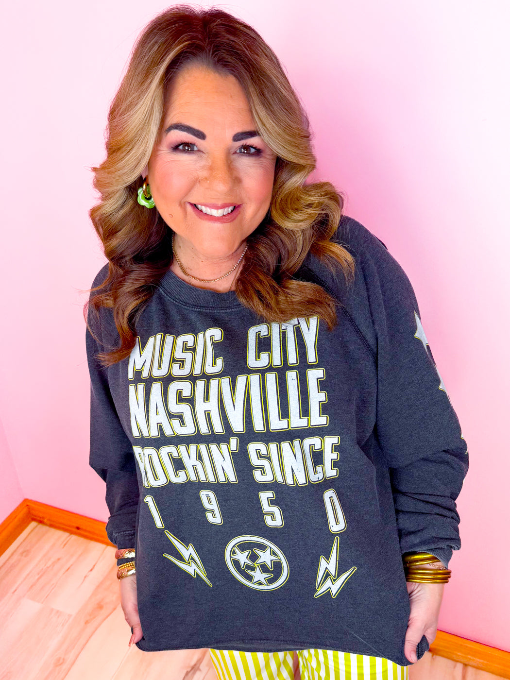 The Music City Rockin’ Pullover brings vintage vibes and all-day comfort together in one must-have layer. Designed in a washed black finish with a bold “Music City Nashville Rockin’ Since 1950” graphic, this pullover delivers that perfectly worn-in look you love. The cotton-blend fabric with a touch of stretch makes it soft, cozy, and easy to move in — perfect for casual days and concert nights alike.