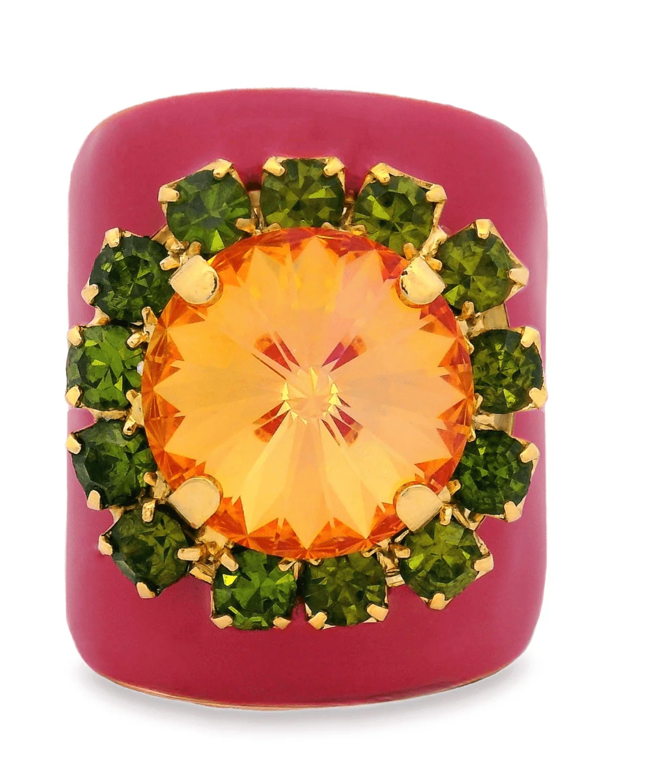 Make a real statement with the Jacci Rings in Enamel Midnight Express! This bold, adjustable ring is made from Light Gold plated Brass base metal and is covered with twinkling high quality crystals. The 12mm stone adds an extra touch of glamour and sparkle. Whether you're dressing up for a night out or adding a bit of bling for a special occasion, this Made in Canada piece will make you shine.