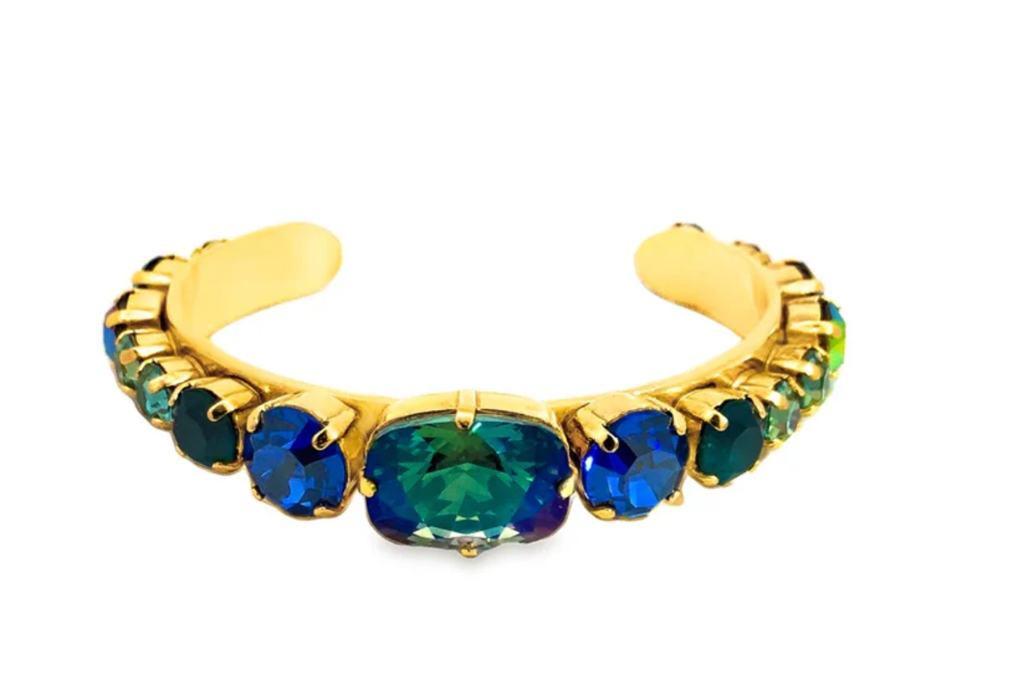 Introducing the Laura Cuff - a touch of whimsy and glamour from Canada. Made of antique gold plated brass and adorned with high quality crystals, this malleable cuff adds a playful touch to any outfit. Perfect for those who don't take themselves too seriously!