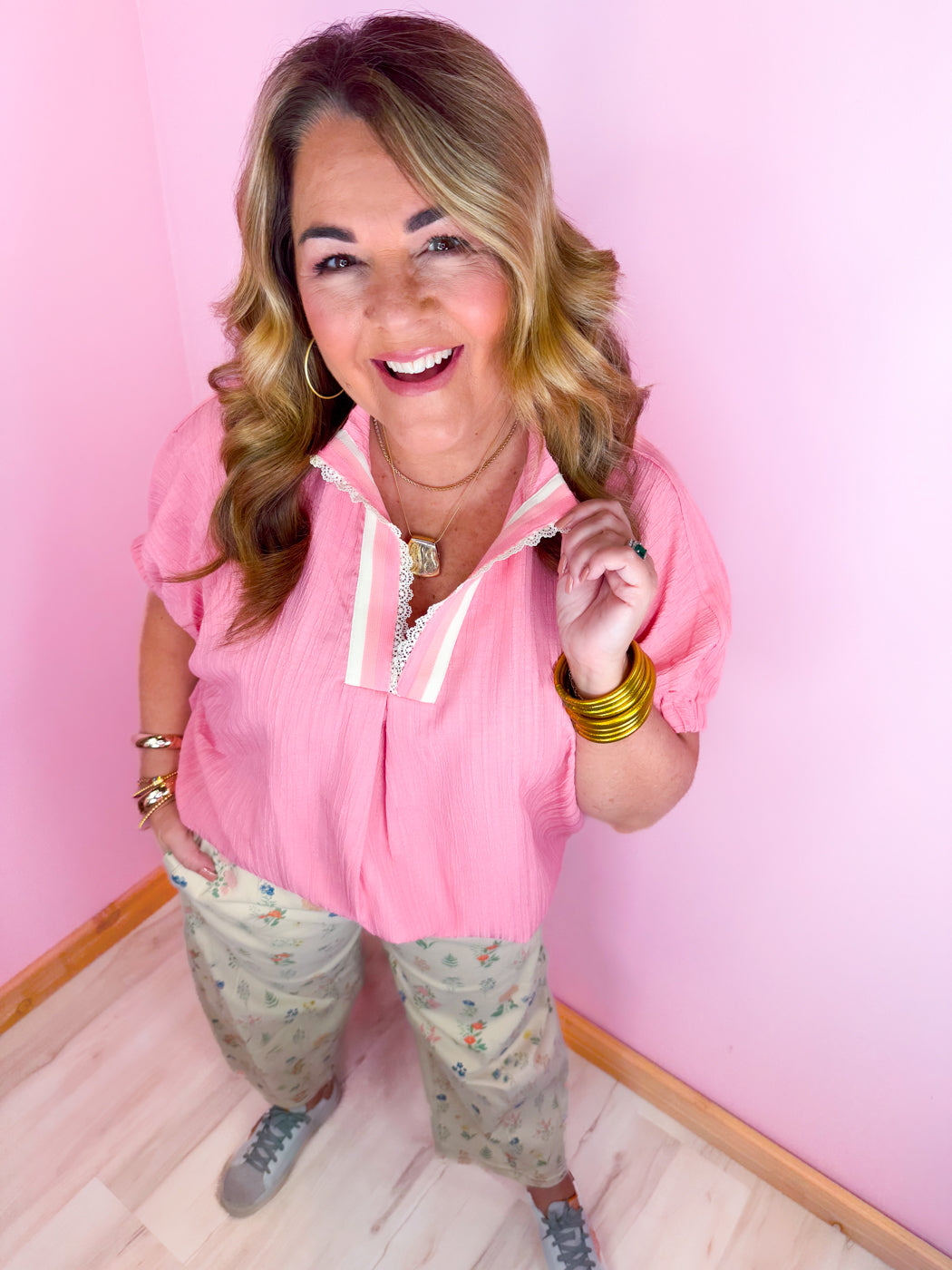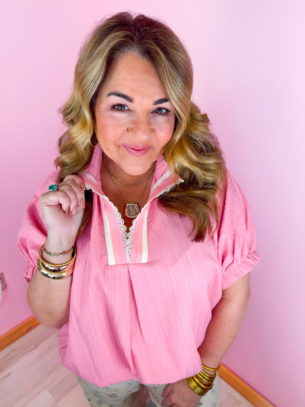 Blush Daydream Top is the definition of soft, effortless charm. Designed in a light pink, blush hue, this lightweight top features a flattering split neckline accented with delicate lace trim for a touch of romance. Short sleeves and a relaxed silhouette make it perfect for everyday wear, whether you’re dressing it up with denim or keeping it casual with shorts.