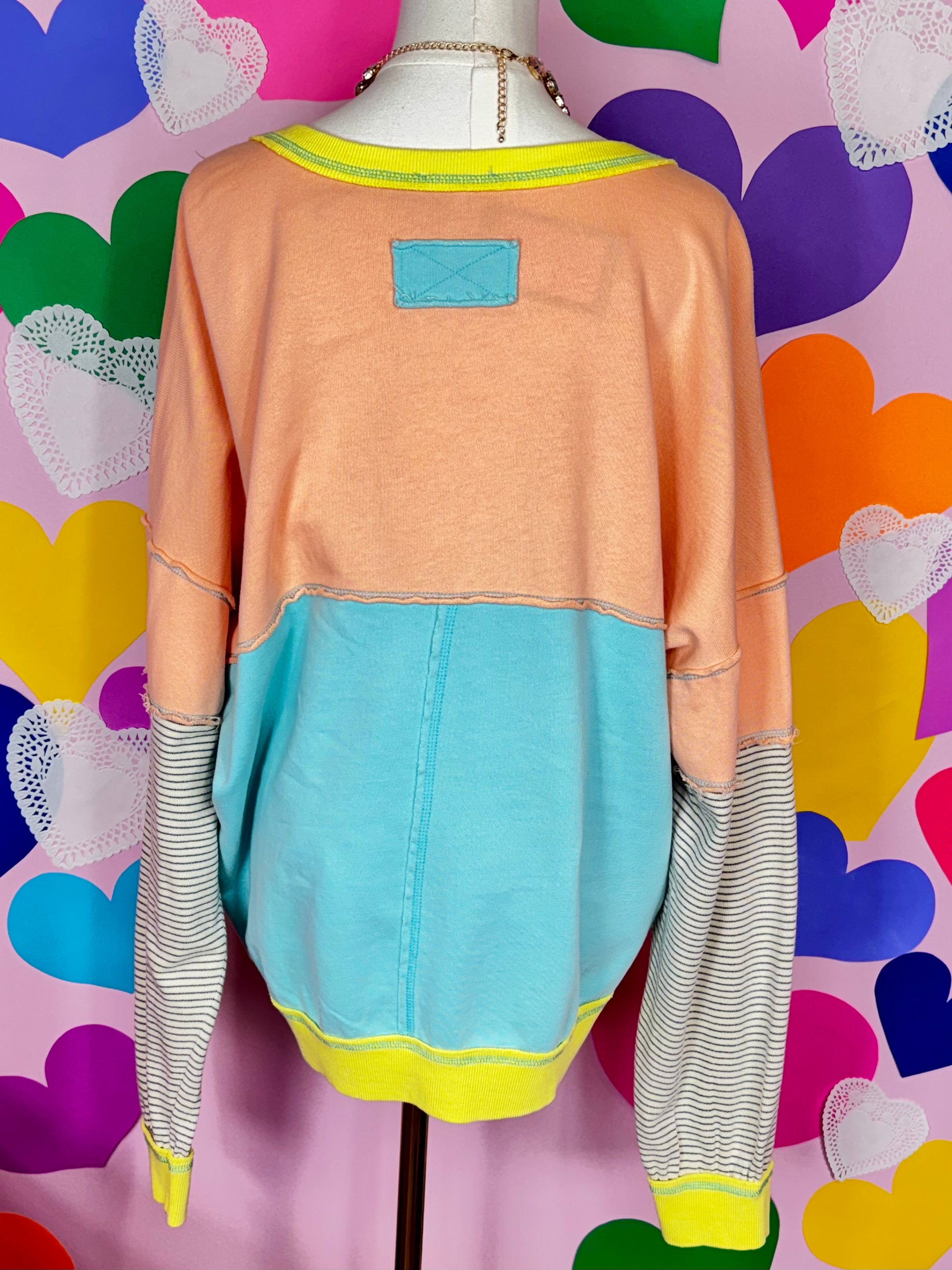 The Easy Does It Pullover is made for laid-back days with a bold, happy twist. Designed in a fresh aqua color-blocked style with peach accents and eye-catching neon yellow trim, this pullover brings fun color and cozy comfort together. The soft cotton fabric and oversized fit make it perfect for relaxed styling, whether you’re heading out or staying in. Just throw it on with leggings or denim for an effortless, standout look.