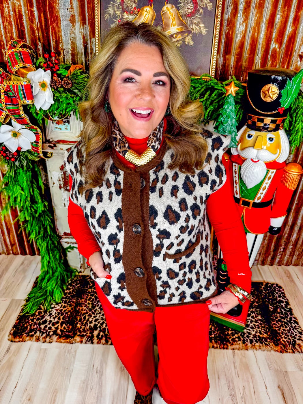 The Wild Side Sweater Vest is a relaxed-fit, button-down piece designed for comfort and versatility. Made with stretchy material, it offers ease of movement while maintaining a polished look. Wear it alone for a simple, cozy outfit or layer it over long sleeves and shirts for added warmth and style. Its classic design makes it an ideal layering piece for winter, easily paired with jeans, skirts, or trousers. The button-down front allows for adjustable styling, whether fully closed or partially open. Lightweight yet warm, this sweater vest transitions effortlessly from casual days to more dressed-up occasions. A practical addition to any winter wardrobe, it combines comfort, style, and functionality for everyday wear!