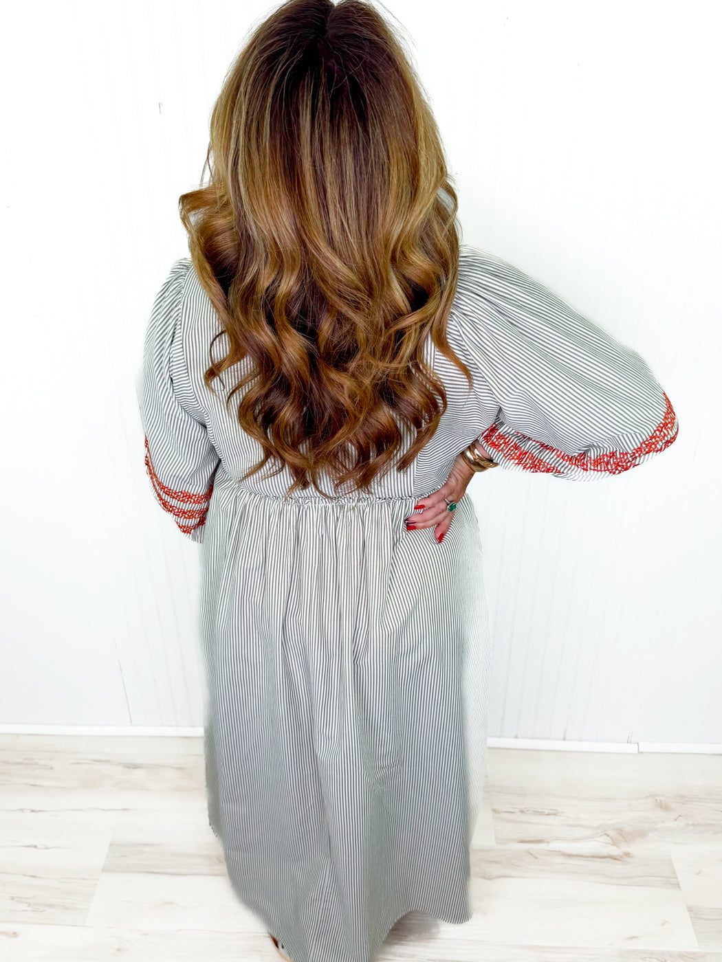The Toasty Pines Maxi Dress is a relaxed and comfortable piece designed for winter style. It features a flattering v-neck and bubble sleeves for added movement and interest. Subtle embroidered details add a touch of elegance without overwhelming the design. The maxi length provides coverage while maintaining a flowy, effortless look. Pair it with booties for a polished winter outfit or flats for a more casual vibe. This dress is versatile and easy to style for everyday wear, holiday gatherings, or special occasions. Its combination of comfort, detail, and seasonal appeal makes it a must-have addition to any winter wardrobe!