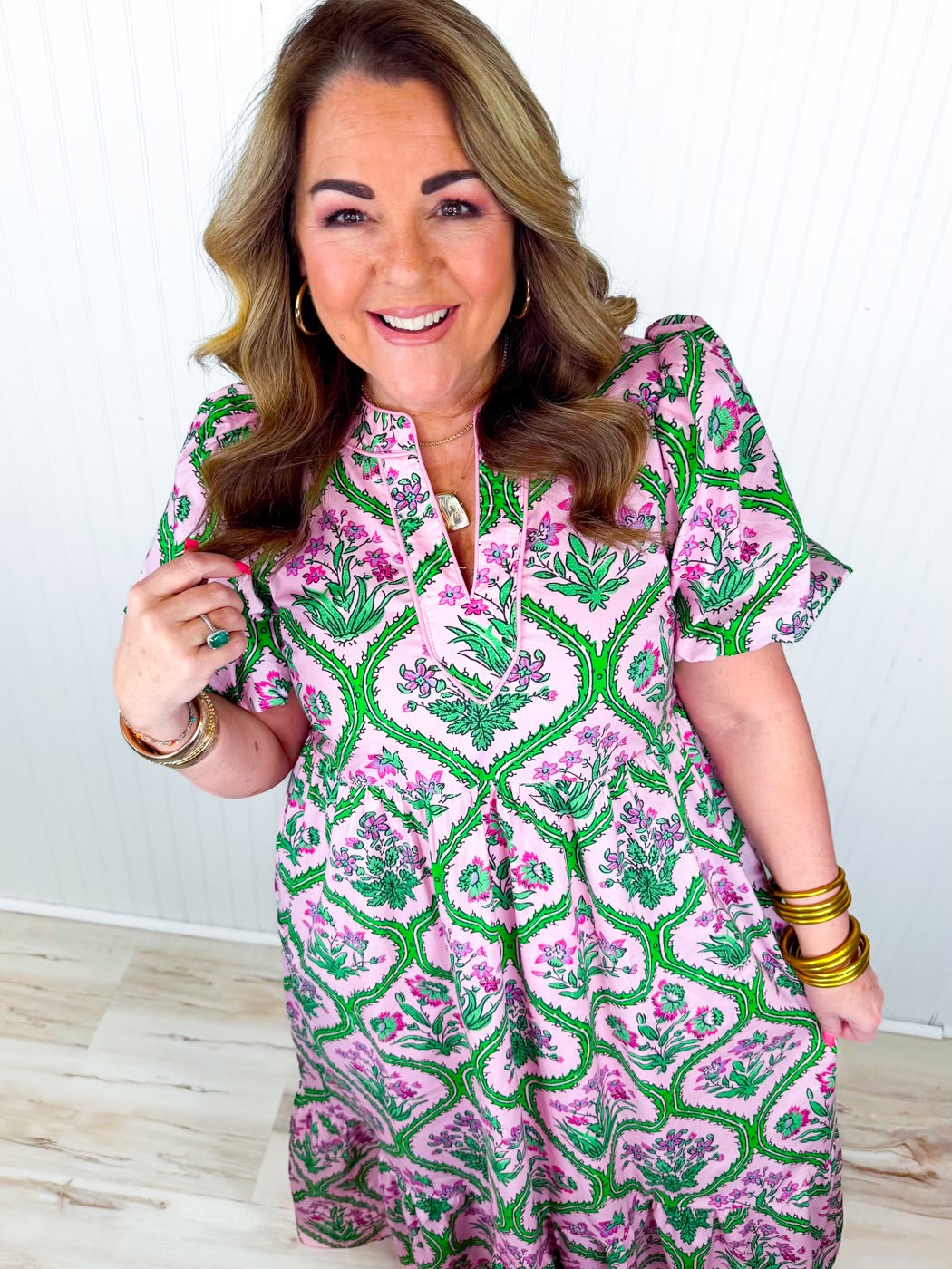 The Bloom in Joy Dress is made for sunshine-filled days and sweet spring celebrations. Crafted from breathable cotton, this beautiful maxi dress features a soft pink and green trellis floral design that captures the joy of the season. The flattering split neckline and playful bubble sleeves add a romantic touch, creating an effortlessly graceful silhouette you’ll love wearing again and again.