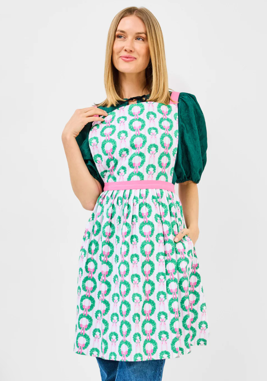 Bake, cook, and celebrate in style with our Rosy Wreaths Adult Apron. Featuring whimsical holiday wreaths topped with charming pink bows, this apron adds a playful, festive touch to your kitchen. Designed with an adjustable neck and waist tie for a comfortable fit, it's perfect for holiday baking, entertaining, or gifting.